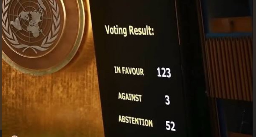 The resolution was adopted with 123 countries voting in favour. Only three countries: the United States, Israel, and Argentina, voted against it, while 52 countries abstained.